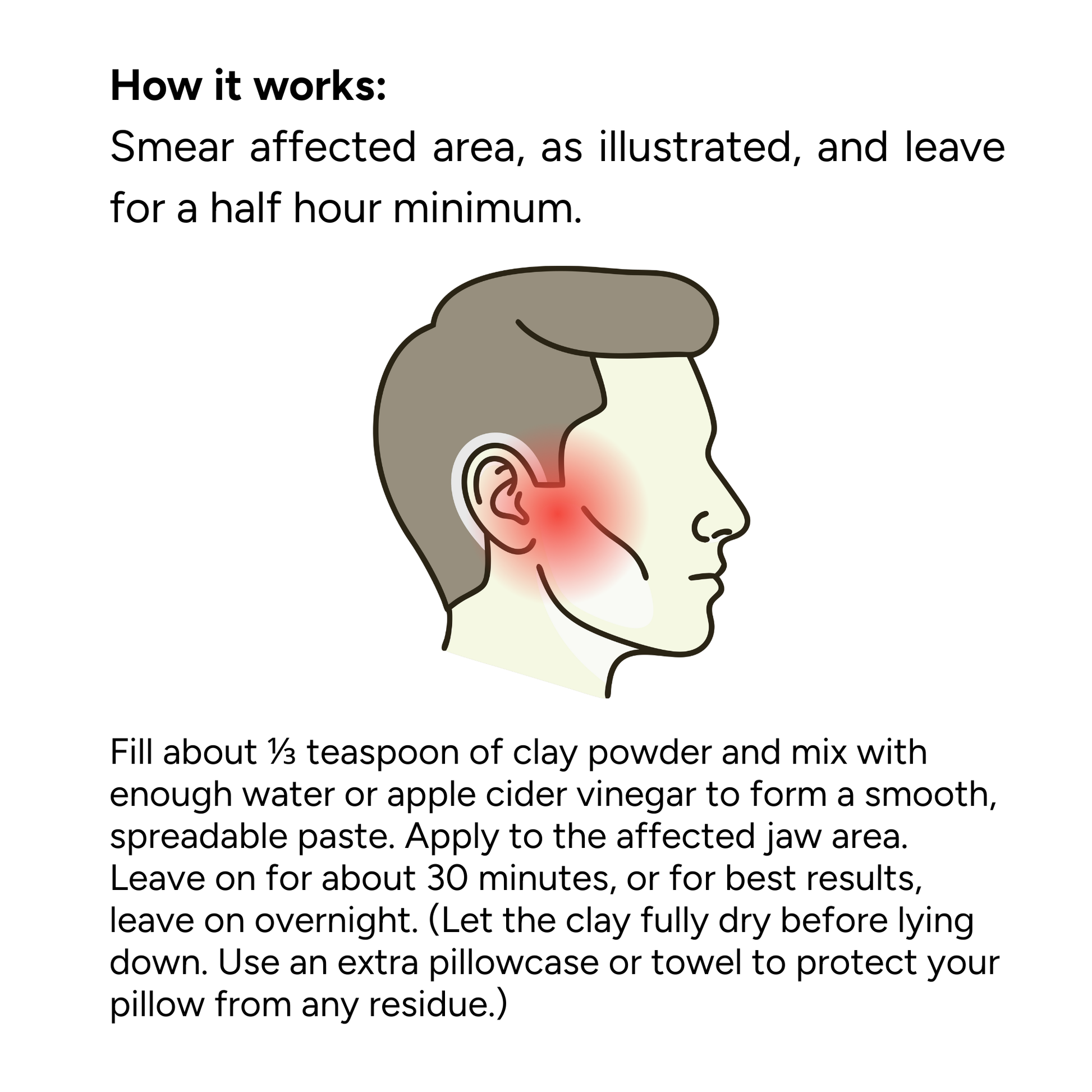 Fill about ⅓ teaspoon of clay powder and mix with enough water or apple cider vinegar to form a smooth, spreadable paste. Apply to the affected jaw area. Leave on for about 30 minutes, or for best results, leave on overnight. (Let the clay fully dry before lying down. Use an extra pillowcase or towel to protect your pillow from any residue.)